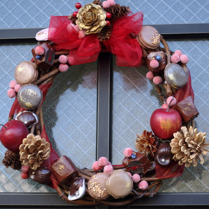 このリースにくっついているお菓子や果物類はフェイクです。